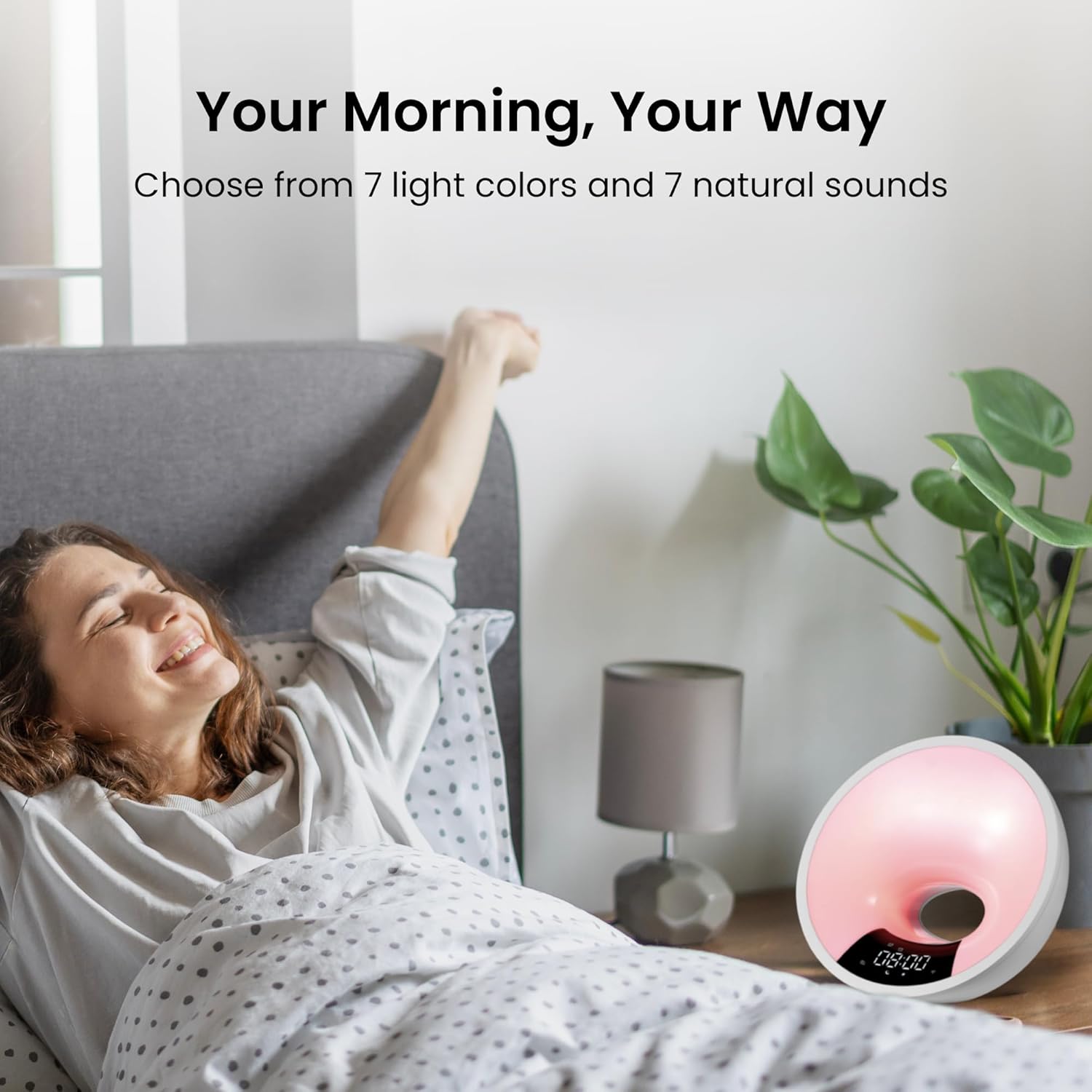 "Wake up and sleep better with the HOM Sunrise Alarm Clock with Wake-Up Light & FM Radio. Designed to improve your sleep-wake cycle, this alarm clock simulates a sunrise, gradually getting brighter to gently wake you up and start your day feeling refreshed. It features 7 colors and 7 natural sounds to personalize your wake-up to your mood and preferences. Control your alarm clock via the HOM app or integrate with Amazon Alexa and Google Home for voice control. Whether you’re winding down at night with the sleep aid feature or listening to your favorite FM radio station in the morning, this alarm clock does it all. Listen to your favorite music, podcasts, or white noise from your device via the alarm clock's Bluetooth connectivity. The HOM Sunrise Alarm Clock is more than just a wake-up device; it's designed to make a rather unpleasant routine more personalized bearable and enjoyable!"